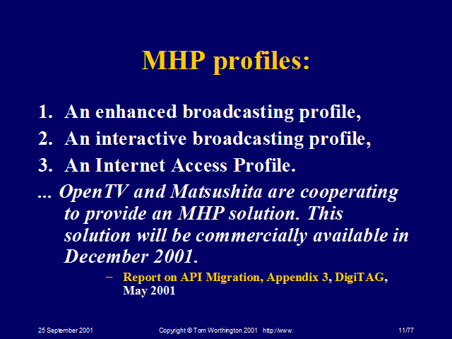 MHP is a broad standard and further details will need to be put in place to produce a workable system. If these details are not standardised, or at least harmonized, content produced for one MHP system will not necessarily be playable on another: Information is reproduced with the permission of OpenTV from a “White Paper” published at IBC 2000... While MHP provides universal interoperability, it is not in and of itself a complete interactive solution. To achieve this degree of interoperability, MHP does not attempt to specify hardware or conditional access interfaces or other implementation-specific details. Also, since the current generation of set-top boxes does not meet MHP’s hardware requirements, a migration path is required that will allow continued interactivity with the currently deployed set-top boxes until it is economically feasible to replace them with MHP-compatible devices. ... OpenTV and Matsushita are cooperating to provide an MHP solution. This solution will be commercially available in December 2001. Report on API Migration, Appendix 3, DigiTAG, May 2001