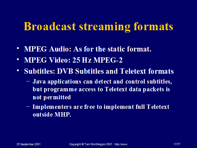 MPEG Audio: As for the static format. MPEG Video: 25 Hz MPEG-2 video is specified. Subtitles: DVB Subtitles and Teletext formats are both provided for subtitles, with the DVB Subtitles taking precedence when both are provided. Java applications can detect and control subtitles, but programme access to Teletext data packets is not permitted. This is presumably to try to prevent unauthorized use of Teletext content. However, it may prevent useful services, such as searching and indexing multimedia content based on the text of subtitles. MHP supports Teletext for subtitles, not as an alternative to web-style content. Implementers are free to implement full Teletext outside MHP.