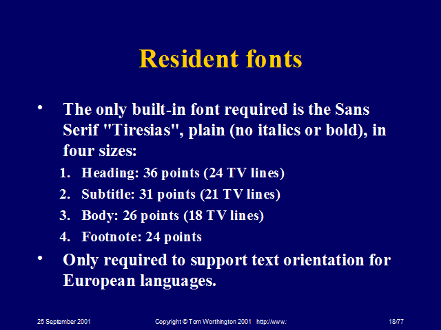 MHP devices are only required to support text orientation as used for European languages (that is horizontal left to right, top to bottom). Note that the default ("body") font size of 26 points is approximately the same as 18 TV lines. While these font sizes are suitable for TV display they are much larger than fonts used in web computer applications.