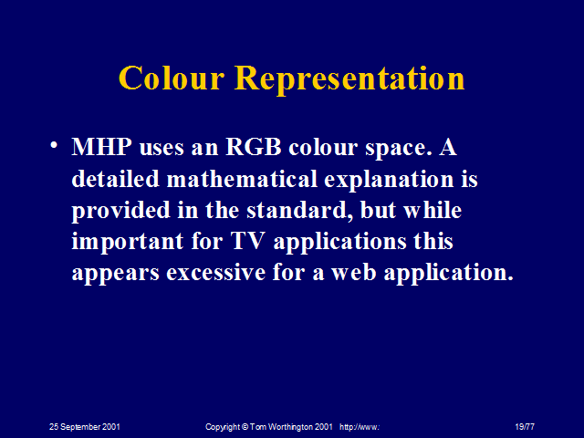 MHP uses an RGB colour space. A detailed mathematical explanation is provided in the standard, but while important for TV applications this appears excessive for a web application.