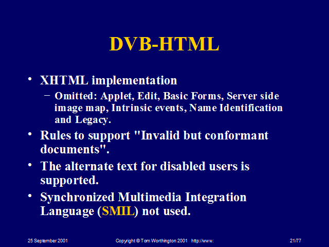 DVB-HTML is a XHTML implementation using European characters and the Document Type Description (DTD) at "http://www.dvb.org/mhp/dtd/dvbhtml-1-0.dtd". Web browsers traditionally attempt to display web pages which do not fully conform to HTML standards, by ignoring unsupported features. MHP attempts to formalize this behaviour with rules to support "Invalid but conformant documents". However, the application of these rules is unclear to this author. DVB-HTML uses XHTML modules: Structure, Text, Hypertext, List, Presentation, Bi-directional Text, Forms, Basic Tables, Image, Client side Image map, Object, Frames, Target, Iframe, DVB Intrinsic events, Metainformation Module, Scripting, Style sheet, Style Attribute, Link and Base Omitted: Applet, Edit, Basic Forms, Server side image map, Intrinsic events, Name Identification and Legacy. The strict use of XHTML would limit the use of some legacy HTML features. One explicitly mentioned in the standard is that the id attribute has replaced the name attribute in specifying a target frame. The result could be that links to target frames will not work, if they use the name attribute. The alternate text for disabled users is supported. An obvious way to implement this would be with text displayed over, or in place of an image. A talking browser could read text to a blind user, but the details are implementation dependent. The accesskey attribute of HTML 4 is implemented. This could be important to TV devices as it allows hypertext to be navigated with a few keys on a TV remote control. Implementations are not required to provide a scrolling mechanism for frames. However it is likely any practical implementation will need to do so. A major limitation of the MHP standard is that it does not define referencing of video segments of finite duration. MHP is not a true multimedia format, in the style of the Synchronized Multimedia Integration Language (SMIL). It provides triggers (discussed below) for synchronization.