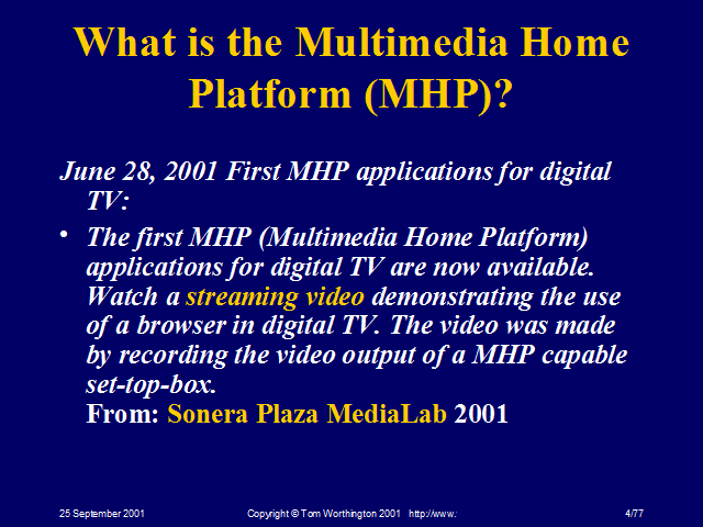 The first MHP (Multimedia Home Platform) applications for digital TV are now available. Watch a streaming video demonstrating the use of a browser in digital TV. The video was made by recording the video output of a MHP capable set-top-box. From: Sonera Plaza MediaLab 2001
