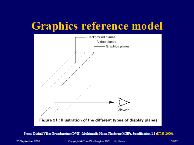 The MHP standard contains a detailed section on the graphics reference model used. It is not clear if this is needed as it duplicates much of the work of CSS. CSS may be inadequate for this application, but producing an enhancement to that standard might be better than create a new separate standard. MHP defines three planes: background, video and graphics. A fourth "subtitle plane" is mentioned once in the standard, but no further details are given (this appears an editorial problem left over from a previous draft). Applications are provided with a contiguous rectangular region of the graphics plane in which they can place video, interface elements and graphics. It can also video on the video plane and still images or colour the background plane. Different applications can be operating in separate regions of the screen. Overlapping regions are clipped, not blended. From: Digital Video Broadcasting (DVB); Multimedia Home Platform (MHP), Specification 1.1 (ETSI 2000). A set of coordinates is defined for graphics used in Java programmes. This is in addition to the coordinate spaces defined for CSS, used in XHTML.