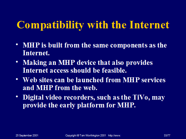 MHP is built from the same components as the Internet. Making an MHP device that also provides Internet access should be feasible. Web sites can be launched from MHP services and MHP from the web. However, MHP is designed to provide Internet-like TV broadcast services, in much the same way WAP was designed to provide web-like services on a mobile telephone. The result is a closed business model very different from the Internet. WAP developers envisaged that WAP content providers would provide a rich range of services for which consumer would be prepared to pay. However, WAP could not compete with the Internet's open and free ethos. An MHP device could be produced from a personal computer with a digital broadcast card and software added. Such a device could support MHP and have good Internet compatibility. However, expanding existing DVB set-top boxes to handle MHP will prove a challenge, even without allowing for Internet access as well. Entry level set-top boxes do not contain a hard disk and so can have only limited software. Digital video recorders, such as the TiVo, may provide the early platform for MHP.