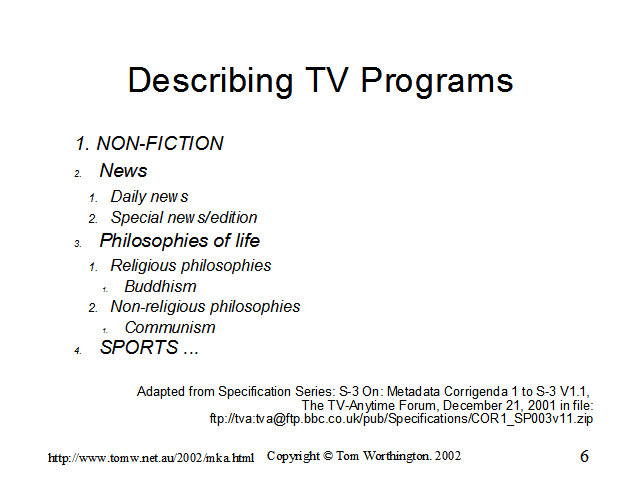 - Adapted from Specification Series: S-3 On: Metadata Corrigenda 1 to S-3 V1.1, The TV-Anytime Forum, December 21, 2001 in file: ftp://tva:tva@ftp.bbc.co.uk/pub/Specifications/COR1_SP003v11.zip