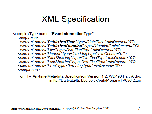 TV-Anytime uses XML syntax for defining what metadata will be used (the schema) and then to actually encode the actual data (instances). The metadata structure is defined using the XML Schema based MPEG-7 Description Definition Language (ISO 2001). XML Schema is a recent web standard for defining sophisticated data structures (Worthington 2001b), which uses the XML syntax.