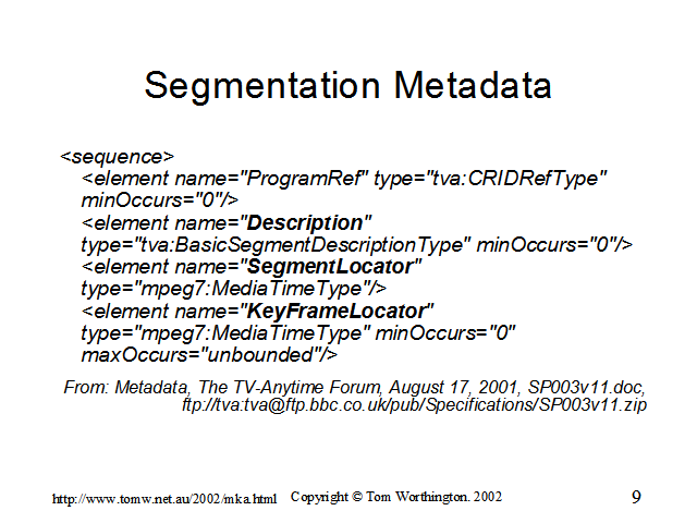 The Segment Information includes a reference to the program the segment belongs to, a description of the content, of the segment. location of the segment (start time and duration).Segmentation Metadata probably provides the most scope for new forms of interactive content with TV-Anytime, but will cause the most problems for current conventional broadcasters. As well as being able to identify whole programs, segmentation allows segments within an audio visual stream to be identified by their start and stop time. This allows content to be restructured and re-used. Highlights can be presented, an index to sections of AV material or the material can be virtually re-editied. The Segmentation Metadata can be provided with the AV content or generated by the viewer or others. An example given by TV-Anytime is in repurposing of content for educational purposes.