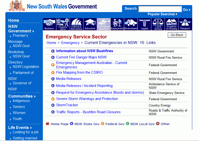 Rather than leading to a NSW Emergency Page (as in the ACT case), the NSW Portal links to a list of emergency related agencies and information. The link from there to "bushfires" brings up a further list of Federal and NSW state government agencies.