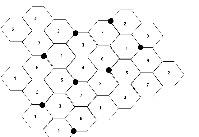 The black circles represent where base stations might be located to provide service to the surrounding cells. Each cell can handle eight simultaneous calls for each frequency set shown.