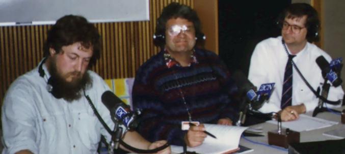 At the studio of ABC Radio 2CN, Canberra 1pm 18 April 1995:Left to right: Karl Auer, John Hilvert and Tom Worthington.