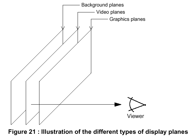 Applications are provided with a contiguous rectangular region of the graphics plane in which they can place video, interface elements and graphics. It can also video on the video plane and still images or colour the background plane. Different applications can be operating in separate regions of the screen. Overlapping regions are clipped, not blended.